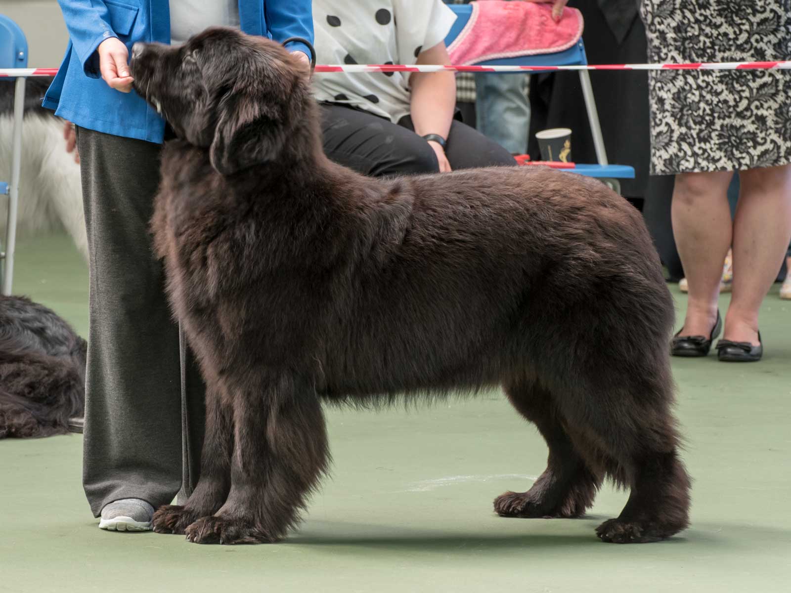 Most of the exhibits were presented in clean and knot free conditions. A few sadly, a point I do not particularly favour or like, is over sculpturing. Newfoundlands do not need it, by all means tidy but not sculpt. Another concern I found was mouths and bites, there were few and far between correct bites which were set square to jaw, very often they were lacking in underjaw and seemed to be giving loose flews too. There was a considerable bone and size variance too within the head ratios and shapes (without the blow drying part), also on some top lines which became evident on the move, and tail sets and in turn their actual carriage, which is one main tool of the job they were bred for, rescue etc. as a strong rudder so loins should be firm, broad and strongly muscled back ends for swimming and not weak in thighs or hocks. This said there were some very good representatives of the breed today and thank you for some super natured dogs and bitches.